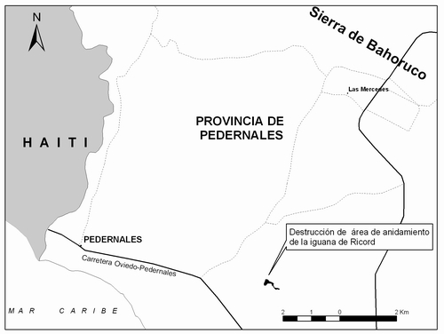 Durante la semana del pasado 6 de febrero de 2006, fue arrasada con bulldozers una de las áreas más importantes de anidación de la iguana de Ricord (Cyclura ricordi) en Los Olivares, Provincia Pedernales. De las dos especies de iguana que posee la República Dominicana (la iguana rinoceronte y la de Ricord), ésta última está en la lista de especies críticamente amenazadas de la IUCN, ya que sólo sobrevive en dos áreas muy pequeñas: en la zona del lago Enriquillo y en el área de Los Olivares. Por esta razón, el año pasado el área de Los Olivares fue declarada un Espacio Municipal Protegido por el Ayuntamiento de Pedernales. El día 10 de Febrero 2006, cuatro miembros del Grupo Jaragua nos desplazamos a la zona para comprobar el daño y tomar medidas inmediatas. Allí nos reunimos con Alcibíades Ledesma, encargado de la Unidad de Gestión Ambiental del Ayuntamiento de Pedernales, Juan Rodríguez (administrador del Parque Nacional Jaragua), y Migue Peña (alias Salvador, asistente de campo en el estudio de éxito reproductivo de esta iguana, que viene realizando Ernst Rupp desde hace más de dos años en la zona). Con el esfuerzo de todos, hemos detenido el avance de esta destrucción. Sin embargo, aunque todavía estas iguanas no han comenzado a anidar, el daño ocasionado posiblemente será desastroso para las mismas. Esto así, porque en caso de que aniden en este lugar, no tendrán la protección ni el camuflage de la vegetación natural, por lo que serán sumamente vulnerables ante los depredadores existentes en la zona (gatos, hurones, mayormente, pero también perros e incluso humanos). Si quieres saber más sobre esta iguana: Rara iguana (artículo escrito por Yvonne Arias) Plan de recuperación de la iguana (ZOODOM 2002)
